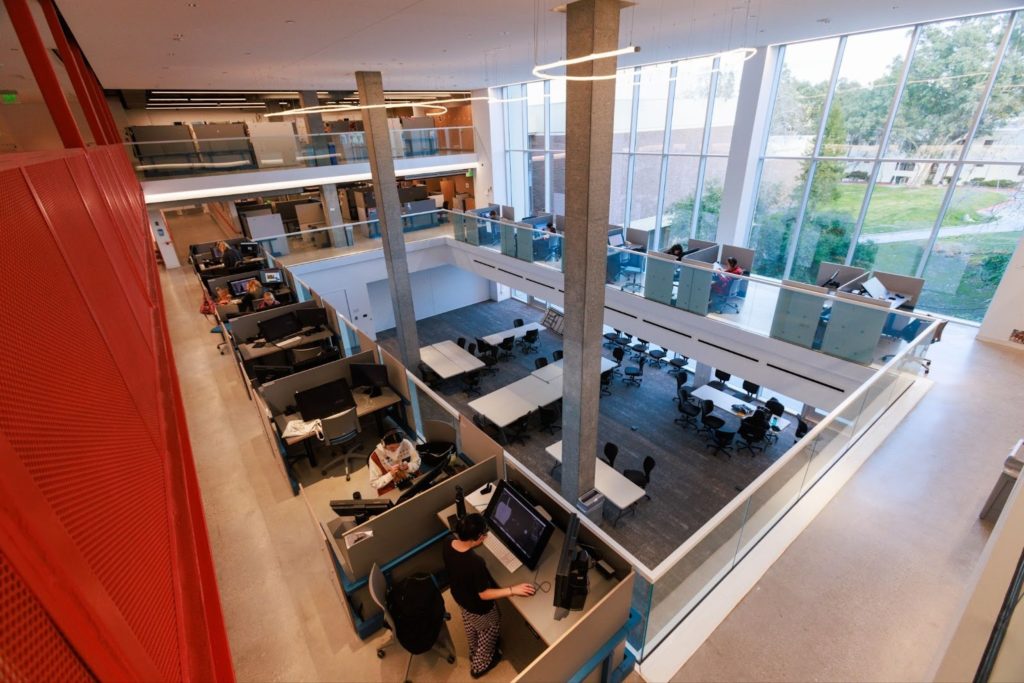 The 3rd and 4th floors of A-Block are dedicated to shared and private student workspaces, collectively known as the Studio. There are lockers and desks that are personally assigned for students to use. Additionally, there is printing and scanning equipment, traditional animation desks for paper animation, and down shooter setups for under camera work.