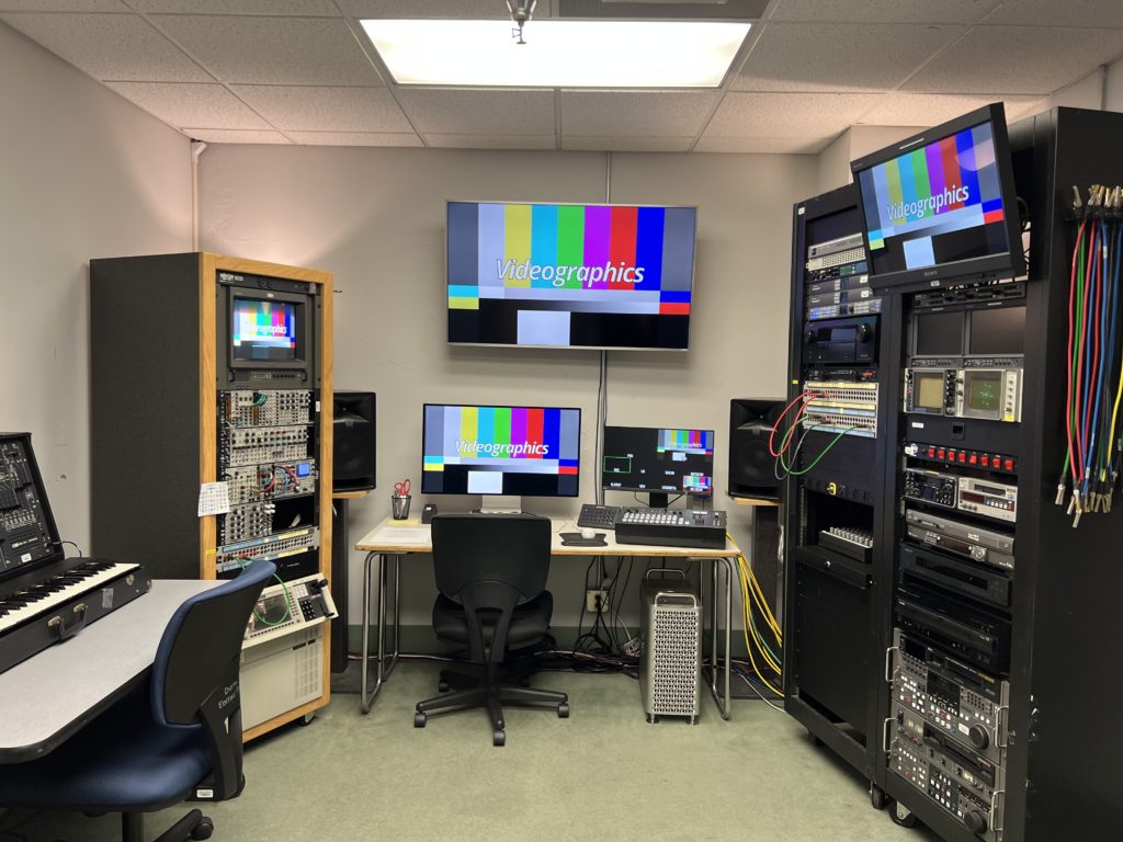 Videographics is a dedicated live analog video generation and manipulation facility. Using any or all of the various generators, unique and subtle electronic images can be created. Audio sources can be used to influence the images via a Eurorack modular video synthesizer. Pre-recorded and live sources can be combined and altered with immediate results, no rendering needed. Sources for pre-recorded materials can include DVDs, DV tape, VHS and Betacam SP tapes. The analog video sources can be transferred into the digital realm via Blackmagic Design hardware and software.