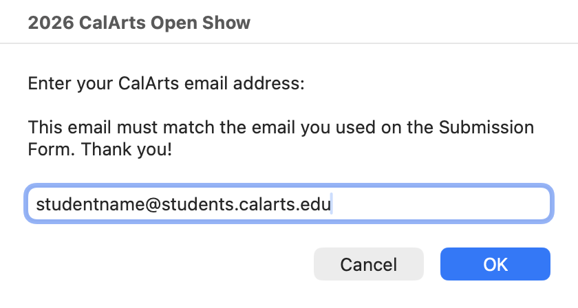 It is very important that you enter your CalArts email address in both your Submission Form, and this application. Please double check that you have spelled your CalArts email correctly.