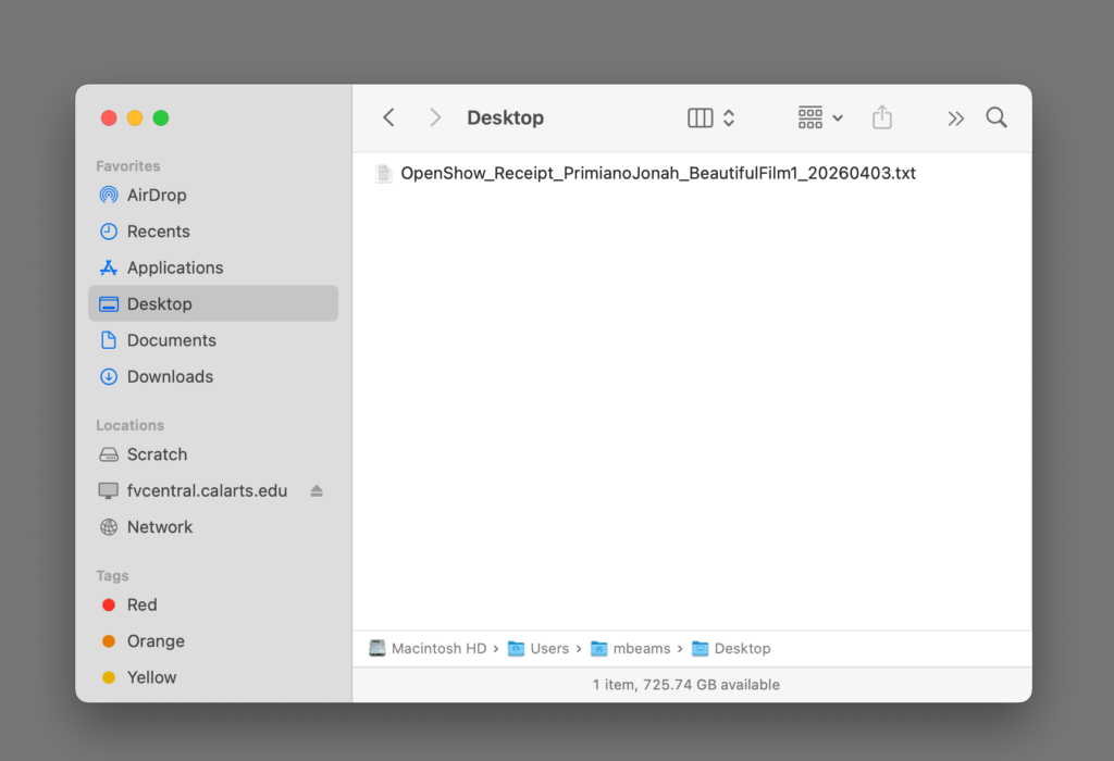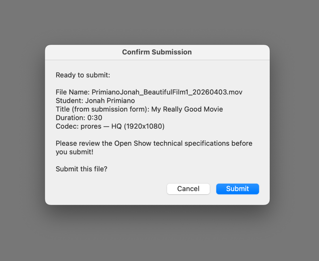 After we receive your Submission Form, you will be able to submit your film and still image using the Submit to Open Show application. If they are submitted anywhere else, we will not be able to locate them and your film will not be added to the show.