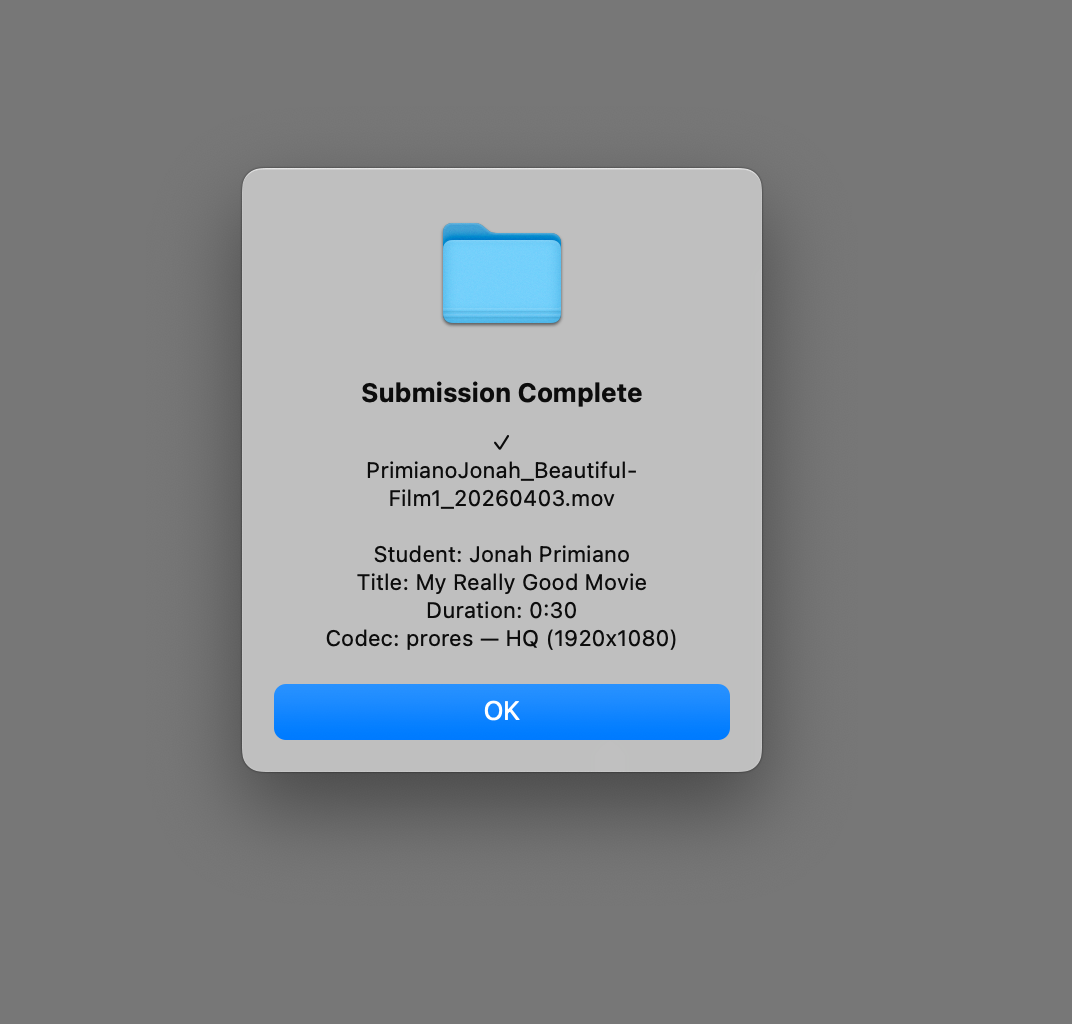 Please plan ahead so that you have finished uploading your film before the deadline. You must log in to an on-campus computer that has access to FVCentral (any lab computers, or those in A221, A321 or A421) in order to submit your film. We recommend planning to submit your film at least 24 hours before the deadline.