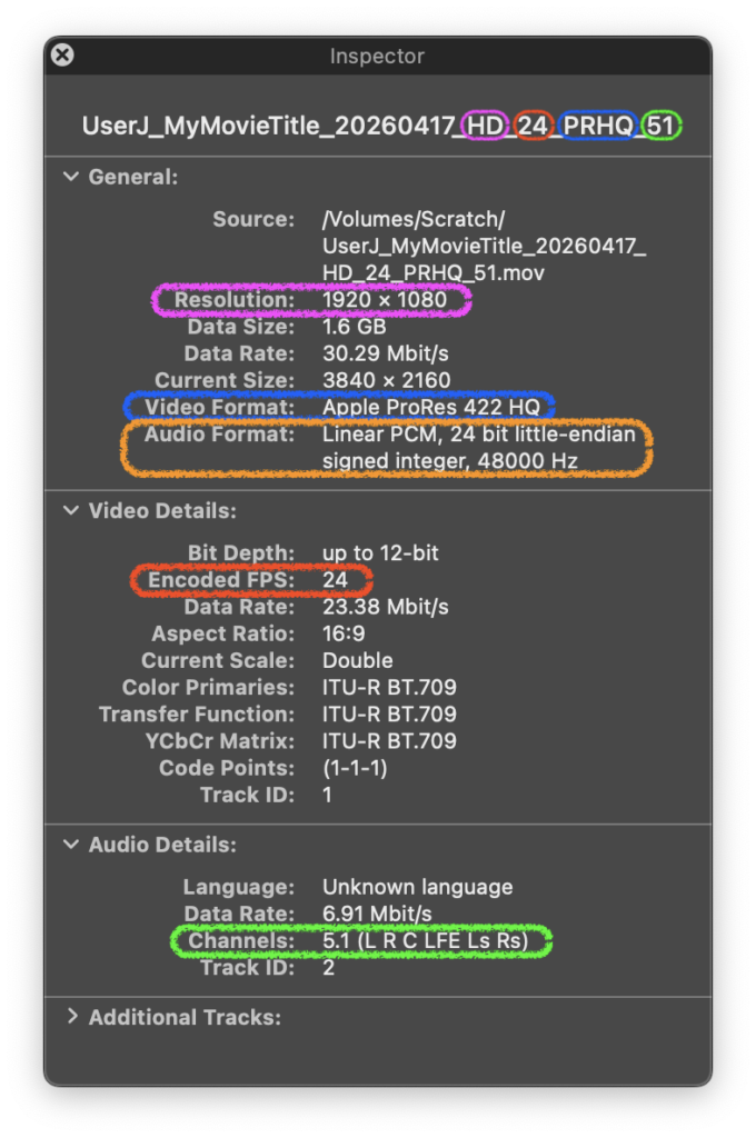 - “Video Format” is your film’s video codec, “Encoded FPS” is your film’s frame rate, and “Audio Format”, lists all the audio settings for your film