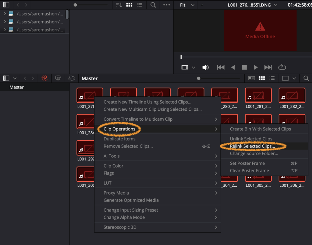 2. In the Media Pool of the Resolve interface: select all media files which need to be relinked, right click, go to Clip Operations, and select Relink Selected Clips…