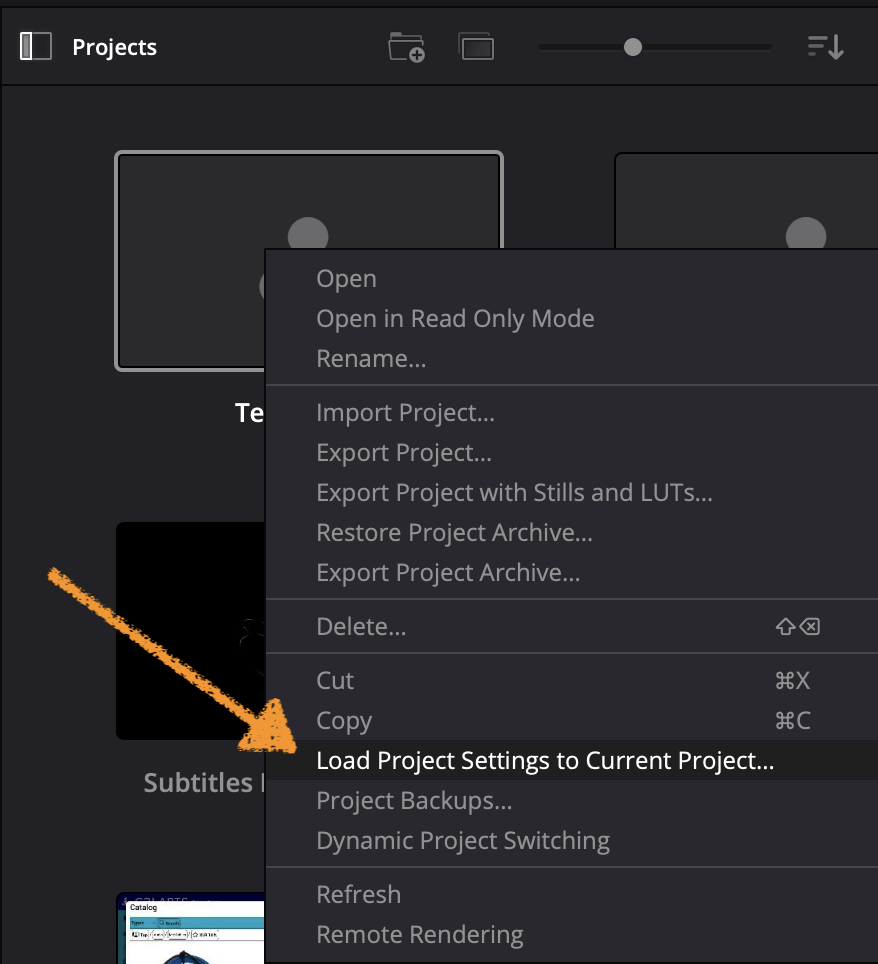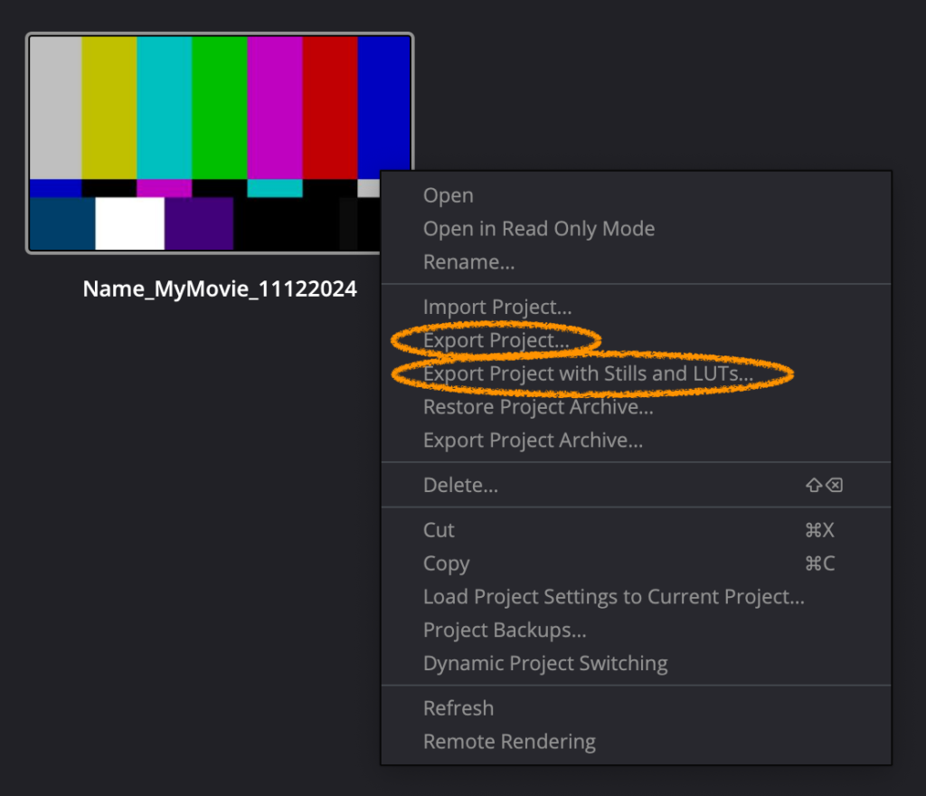 Optionally, you can export your project including all Stills and LUTs you have created within it. Choose the next option Export with Stills and LUTs from the drop down menu.