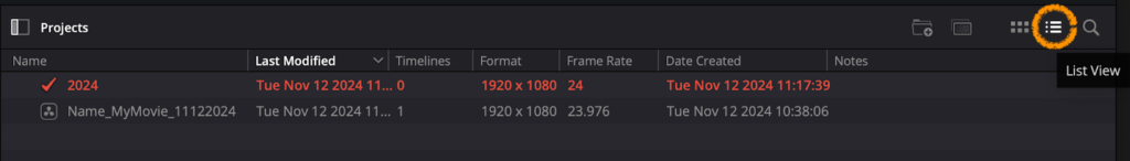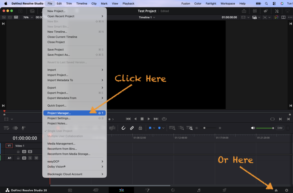 If you’re already inside Resolve, you can reopen it at any time by clicking the Home icon in the lower-right corner of the interface or by selecting File > Project Manager.