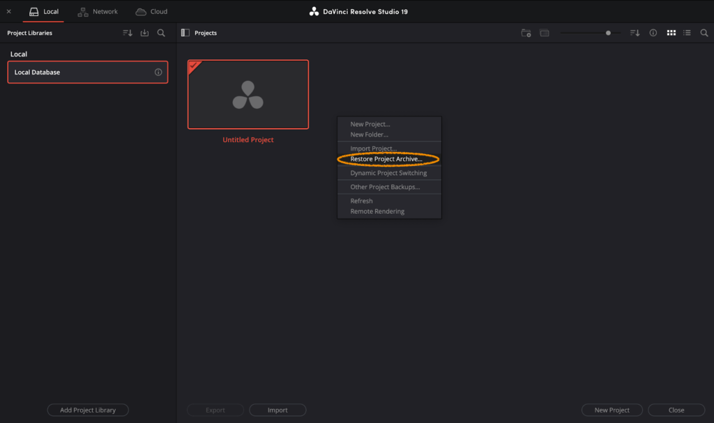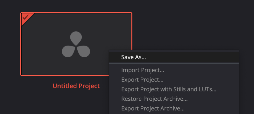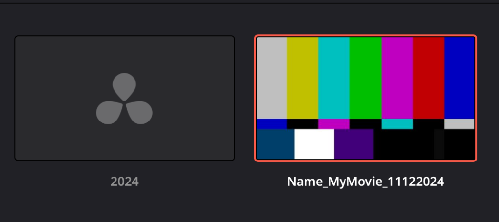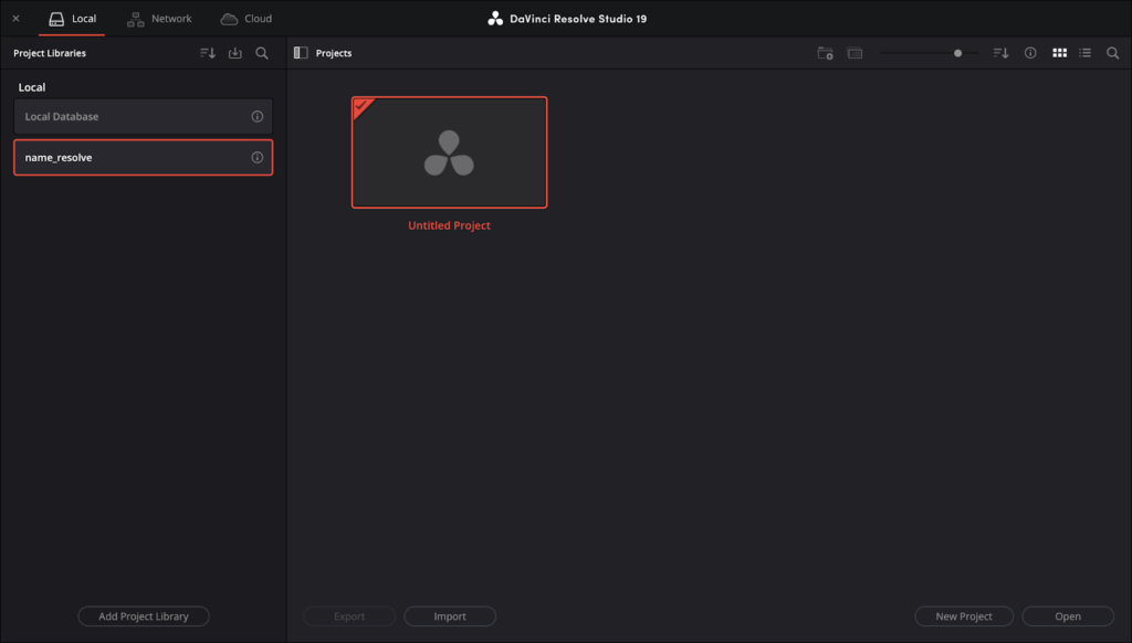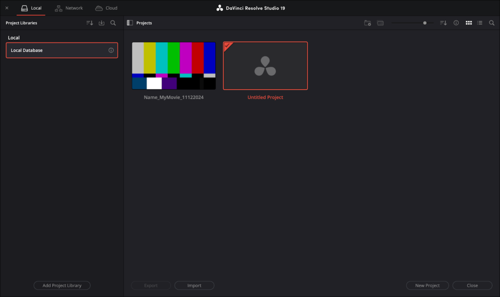 In the Project Manager, you can choose the project you would like to continue working on. Additionally, Resolve creates a new Untitled Project by default. If you have no projects in your library yet, it will only display the Untitled Project.