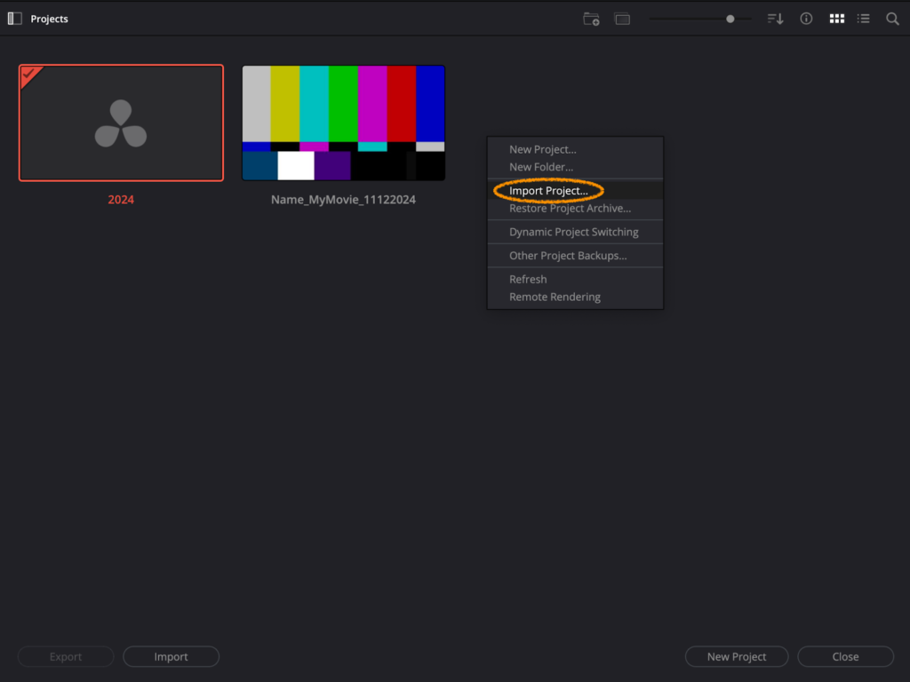 If you have multiple libraries on your drive, or if you need to move projects to a different computer or drive you might want to import or export projects across those libraries. Note that this function only applies to your project file, while your media stays in the original location on your drive.
