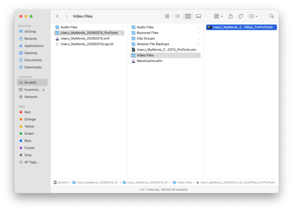 In the Finder, locate the video reference file that you exported from Premiere Pro. Copy it into the Video Files folder in your Pro Tools session folder.