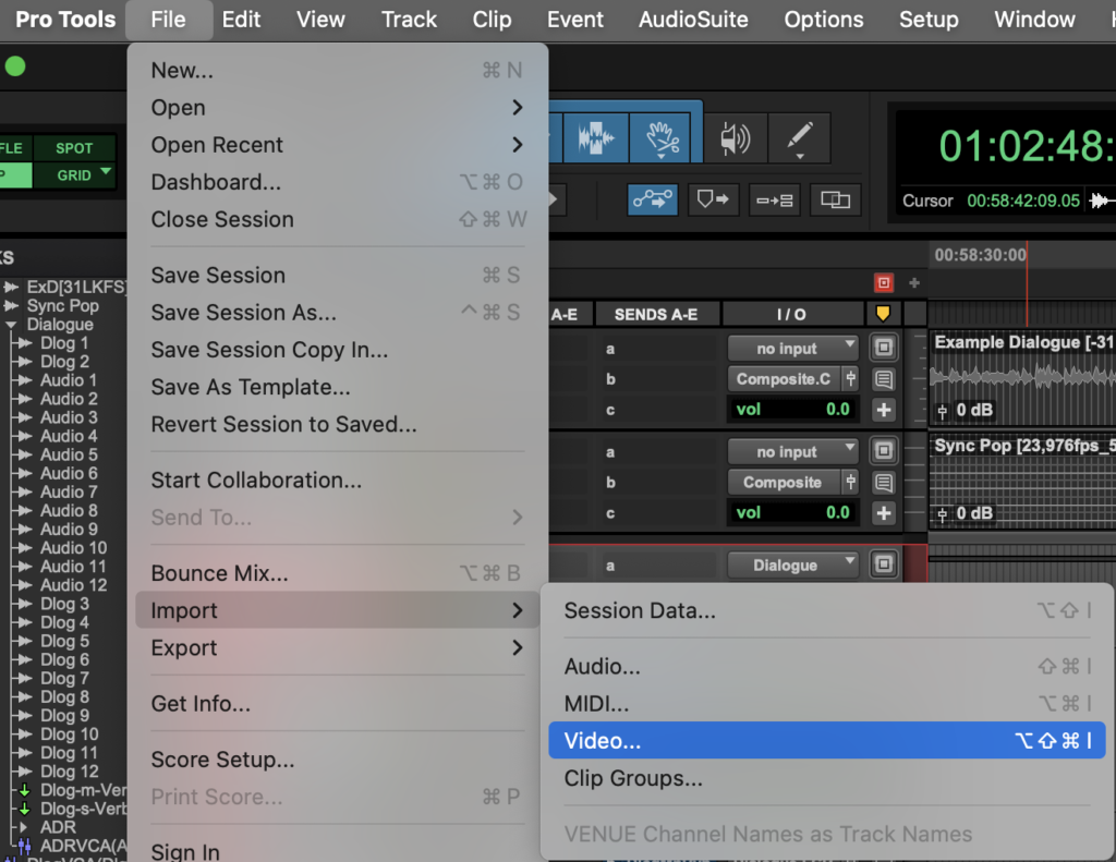 In Pro Tools, go to File > Import > Video and select the video reference file that you just copied into the Video Files folder in your Pro Tools session folder. Click Open.