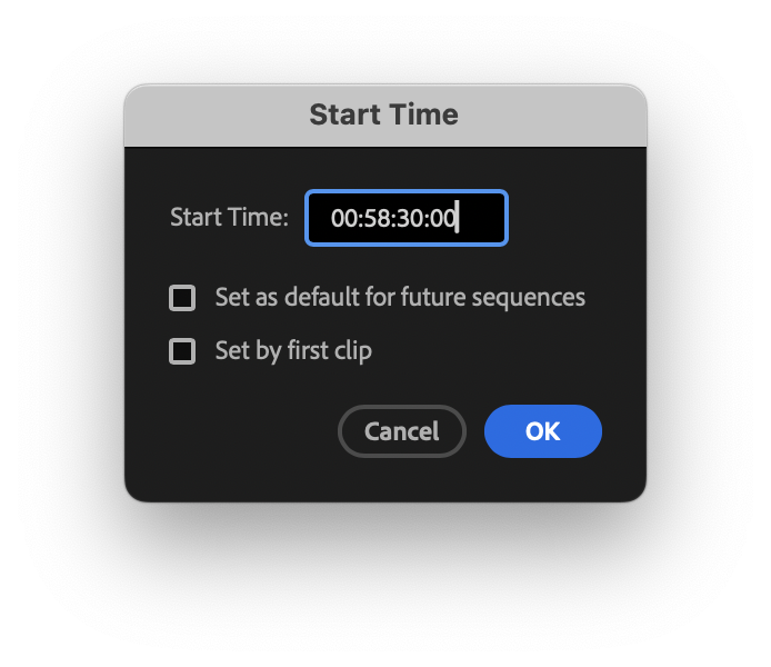 To check your start time, choose Start Time… from the Timeline panel menu and, in the dialog that appears, enter 00:58:30:00. Click Ok.