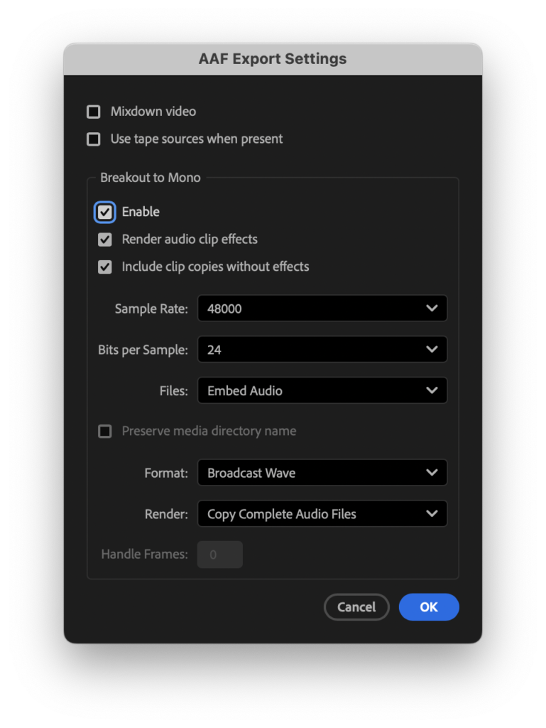 In the AAF Export Settings window, leave Mixdown Video unchecked.