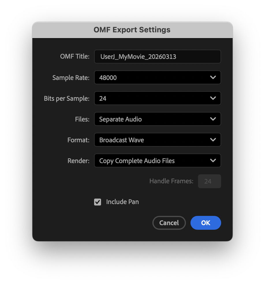 In the OMF Export Settings window, name the OMF. Set Sample Rate to 48000, Bits per Sample to 24. Files to Separate Audio, Format to Broadcast Wave, Render to Copy Complete Audio Files. Click Ok.