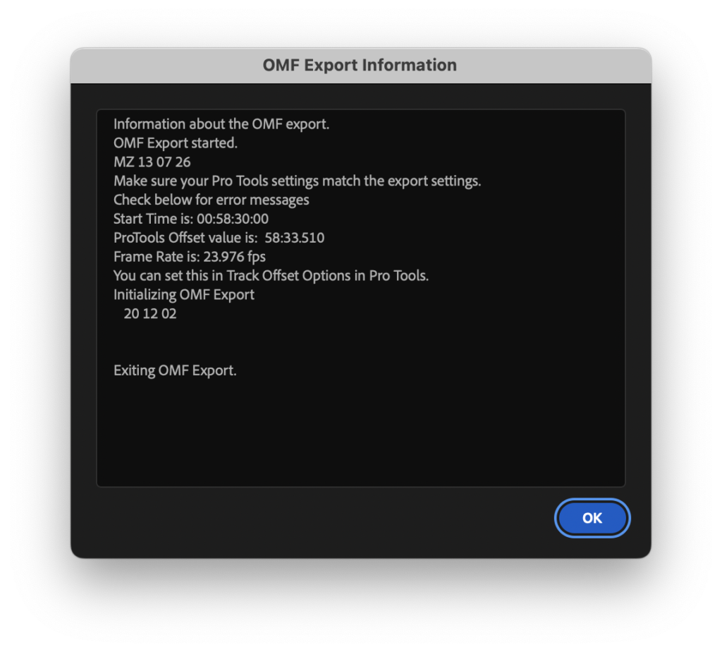 When the OMF is done, an OMF export information window will pop up. Check for any error messages.