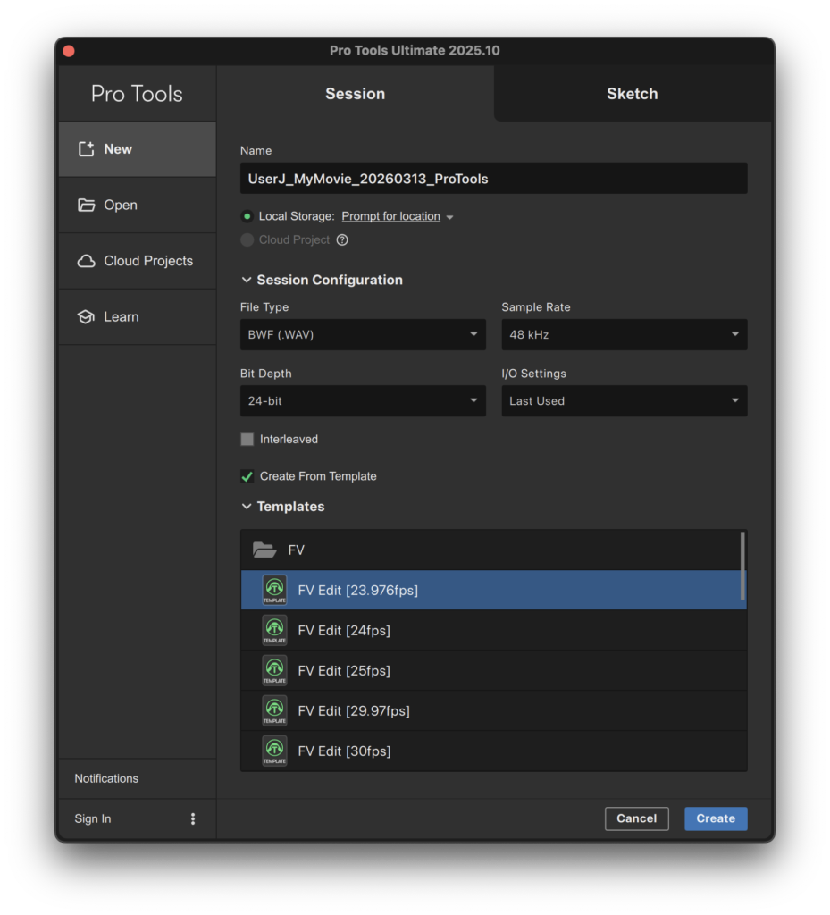 Launch Pro Tools. Check Create from Template. Choose the FV Edit template which matches your project frame rate.