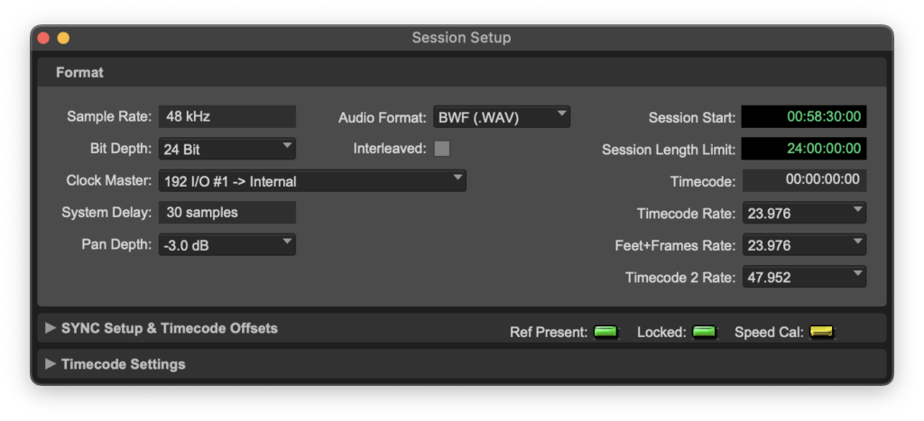Now go to Setup > Session and check that the Session Start reads 00:58:30:00 and the Timecode Rate matches your project frame rate. Then close the Session Setup window.