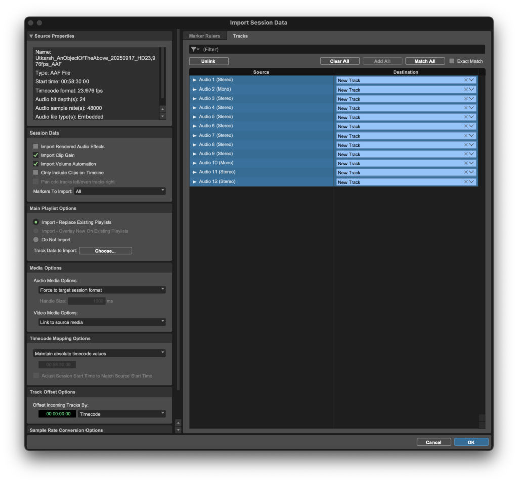 If your AAF contains a video track, click on said Video track under Source to deselect it – the Destination will change to (none). Then under Session Data, check Import Clip Gain and Import Volume Automation. Leave Import Rendered Audio Effects and Only Include Clips on Timeline unchecked. Then click Ok.
